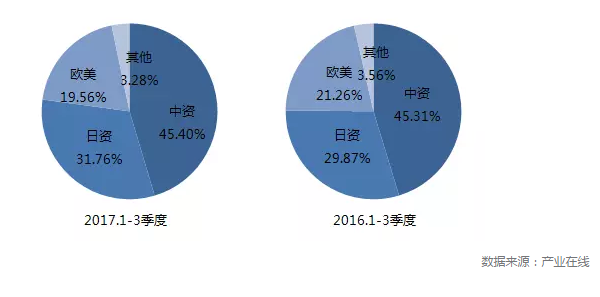 據產業在線統計數據,從整體市場占有率來看,今年前三季度,中資、日資和歐美企業的市場占比分別為45.40%、31.76%和19.56%,相較于去年,中資和日資企業的市場占有率同比增長分別為0.08%和1.89%,而歐美企業占比則下滑1.7%。